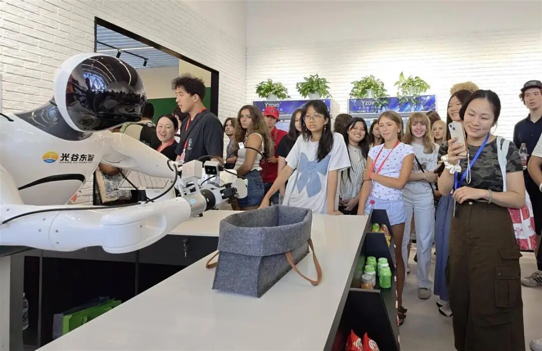 2025年7月29日上午,近百名美国“飞虎队”青少年夏令营成员走进湖北人形机器人创新中心,深入体验了人形机器人的生活应用场景,纷纷点赞湖北尖端机器人技术成果。(湖北日报全媒记者 陈少哲 摄)