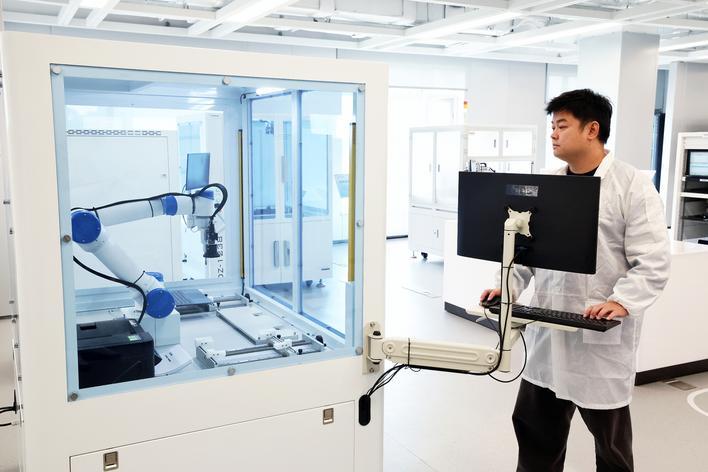 鸿蒙生态(武汉)创新中心星汉实验室内,工作人员通过六轴机械臂模拟用户的真实操作,进行人机交互测试。