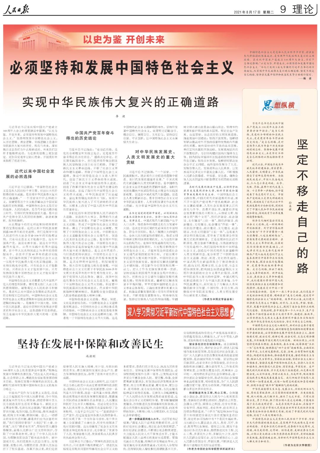 中国特色社会主义是党和人民历经千辛万苦、付出巨大代价取得的根本成就,是实现中华民族伟大复兴的正确道路。在庆祝中国共产党成立100周年大会上,习近平总书记强调:“以史为鉴、开创未来,必须坚持和发展中国特色社会主义。”人民日报17日刊发的3篇文章围绕习近平总书记的重要论述,从实现中华民族伟大复兴的正确道路、坚定不移走自己的路、坚持在发展中保障和改善民生等方面进行探讨。